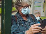 WOMAN WAITING AT THE BUS STOP WITH MASK