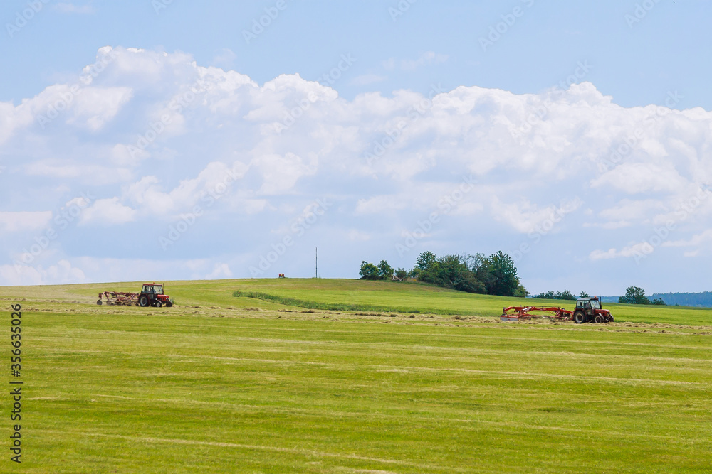 Two Tractors rakes dry grass and places hay for loading and hauling.