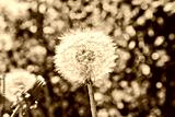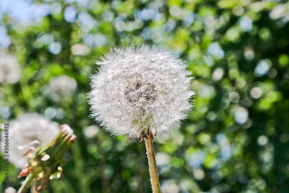 Dandelion with fluffy seeds, blurred backdrop. Round bloom dandelion head. Summer background. Close-up.