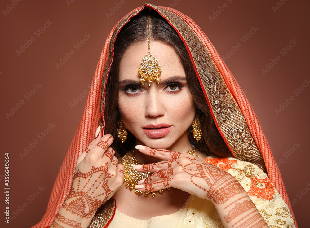 Mehndi. Portrait of beautiful indian girl in saree. Young hindu woman model with kundan golden jewelry set. Traditional Indian costume lehenga choli. Henna art mehendi on woman's hands.