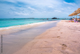 Tropical sandy beach with sandcastles and turquoise water, in Elafonisi, Crete, Greece