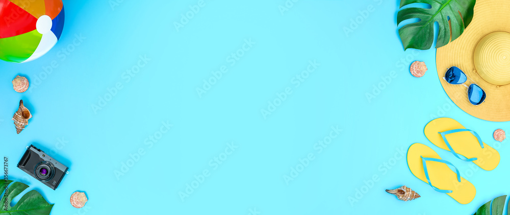 Summer vacation concept top view background. Flat lay banner illustration of summer symbols. Flip flops, sun glasses, shells, camera, beach ball. 3D rendering.