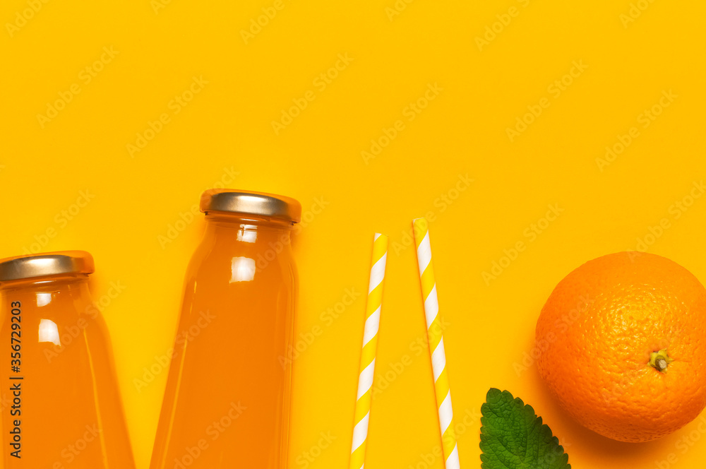 Creative summer concept. Glass bottles with orange juice, fresh sweet oranges, mint leaves and drinking tubs on yellow background. Healthy food, healthy drink, vitamin C. Flat lay top view copy space