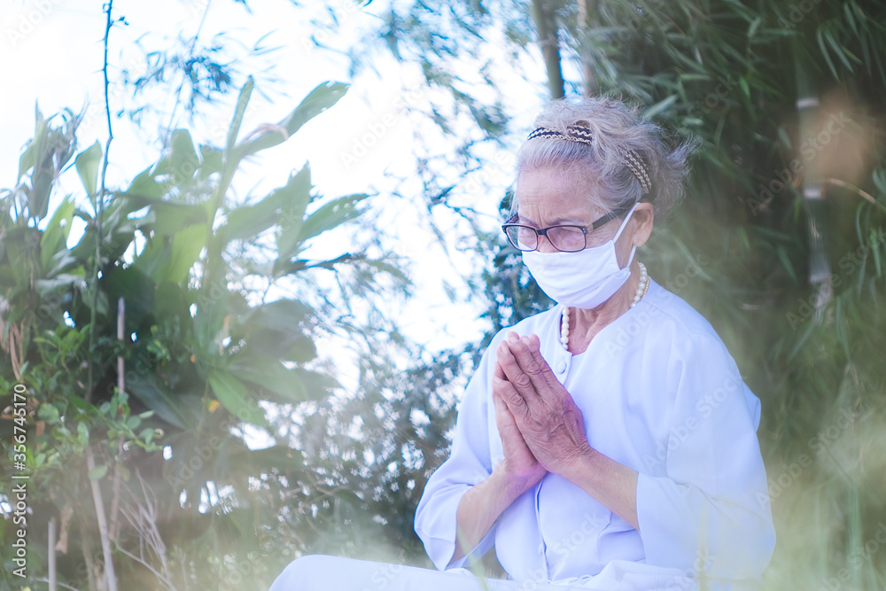 Old woman wearing mask and praying covid-19 or corona virus outbreak in park