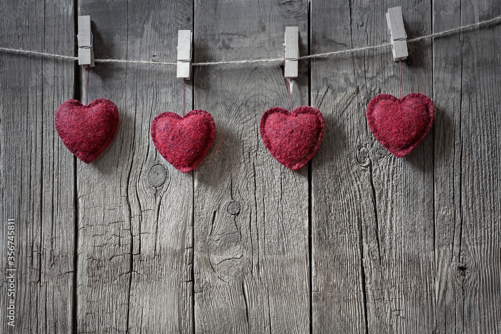 Red hearts hanging on clothespins on wooden background. Valentines day greeting card. Top view with copy space.