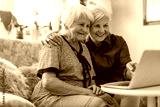 Adult daughter teaching her elderly mother to use laptop