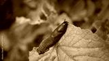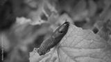 Spanish slug Arion vulgaris snail parasitizes on radish or lettuce cabbage moves garden field, eating ripe plant crops, moving invasive brownish dangerous pest agriculture, farming farm, poison