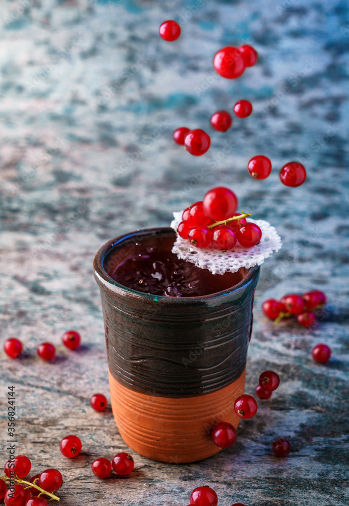 Fresh berry alcoholic cocktail with vodka, ice, currant in ceramic glass on textured background. Studio shot of drink in freeze motion, flying drops and berries. Summer cold drink and cocktail