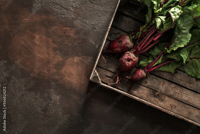 Beetroot in wooden box on dark background. Fresh vegetables, healthy organic food, harvest, agriculture, top view