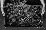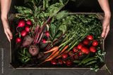 Woman hands holding wooden box with fresh vegetables on dark background. Healthy organic food, vegetables, agriculture, top view