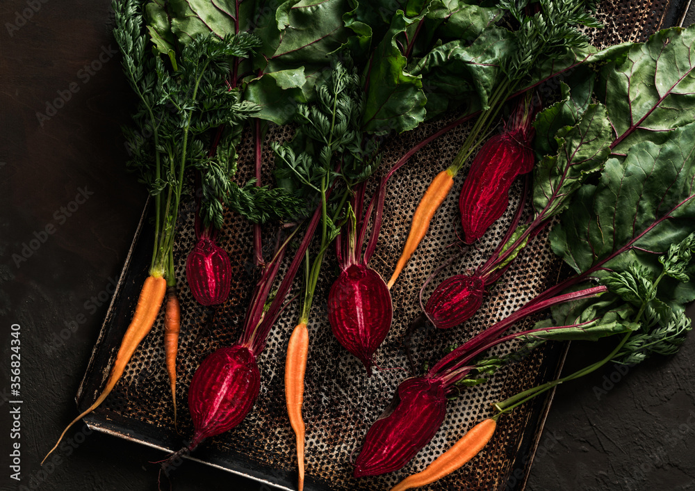 Beetroot and carrots for roasting on baking tray on dark background. Fresh vegetables, healthy organic food, harvest, top view