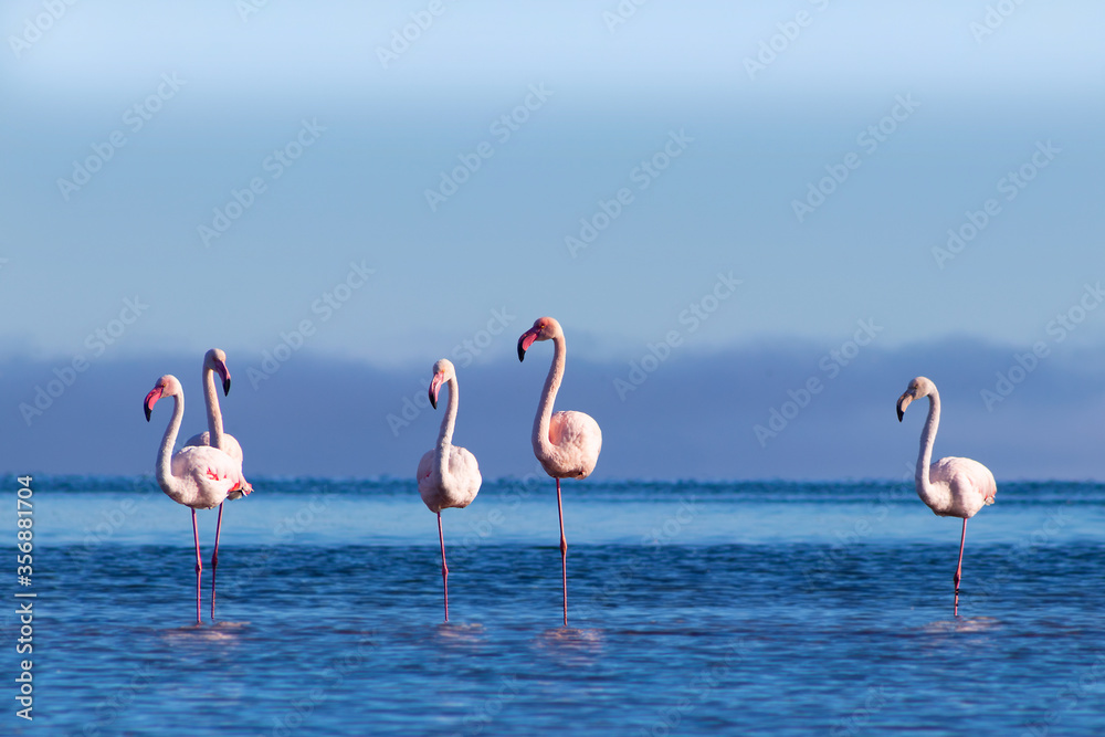 Wild african birds. Group birds of pink african flamingos walking around the blue lagoon