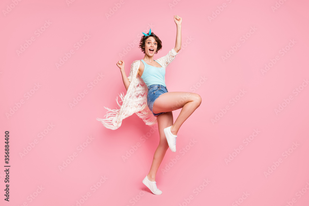 Full length body size view of her she nice attractive lovely pretty cheerful cheery glad ecstatic positive girl dancing having fun rejoicing air wind blowing isolated over pink pastel color background