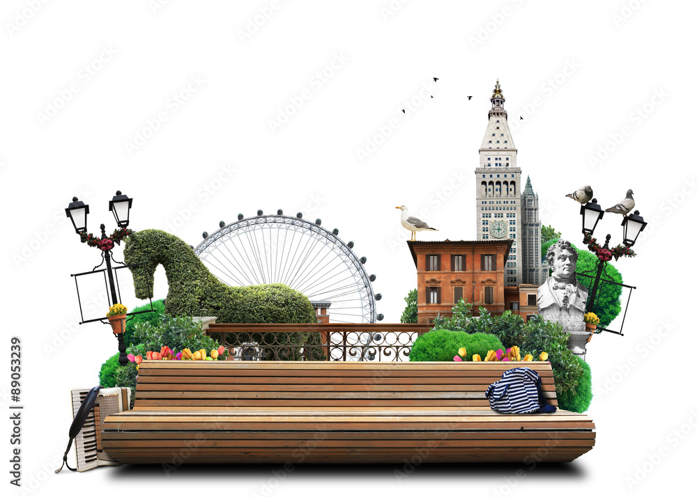 Young beautiful smiling girl in red sweetshot and blue jeans with paper bags for shopping sitting on chair after buying. Shopping concept, isolated on white background.