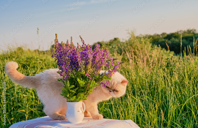 Bouquet of fresh violet wildflowers and cute domestic beige cat