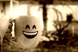 Mão segurando uma caneca de café com rosto sorrindo, lembrando um emoji. A cor da caneca é amarela e ao fundo há um jardim com palmeira e bromélias
