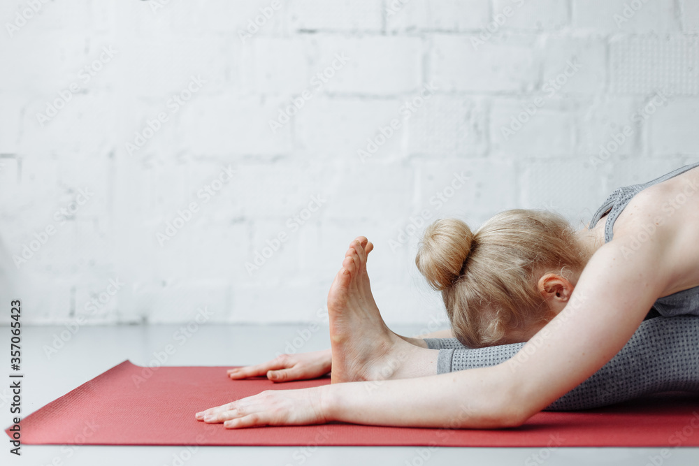 woman in triang mukhaikapada pashchimottanasana yoga position. Young attractive woman practicing yoga, working out, wearing sportswear, pants and top, indoor full length, yoga studio