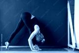 Sporty attractive young blond woman doing Pyramid Pose, Intense Side Stretch Posture, Parsvottanasana, studio full length isolated shot, profile view on pink background
