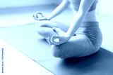 Meditation concept. Close up of hands of young office yogi woman sitting cross legged in yoga Easy Sukhasana Pose on pink mat, meditating with fingers in Jnana mudra