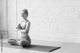 Young attractive woman practicing yoga, sitting in Padmasana, exercise, Lotus pose, namaste, working out, wearing sportswear, t-shirt, pants, indoor full length, near floor window