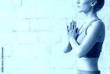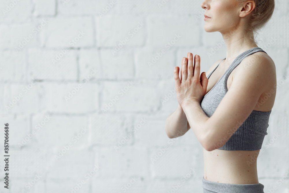 Attractive young woman working out in loft interior, doing yoga exercise, sitting in Half Lotus, Ardha Padmasana with palms in Namaste, meditating, breathing, full length, copy space