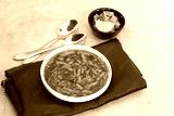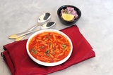 Traditional Sev bhaji or sev tamatar nu Shaak. its a sweet & spicy tomato curry topped with sev. Sev is a crisp fried gram flour vermicelli. Served with chopped onion and lemon. with Copy space.