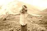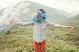 Happy traveler woman walking in summer mountains.