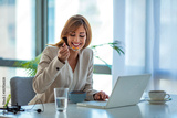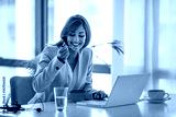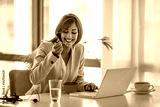Businesswoman eating cereal and looking at laptop in office. Eat good, work good. Woman has healthy business lunch in modern office interior, diet and vegetarian nutrition concept.