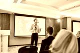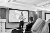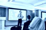 Advanced level education. Young male speaker in suit with headset and laser pointer giving a talk at business meeting, ecological forum