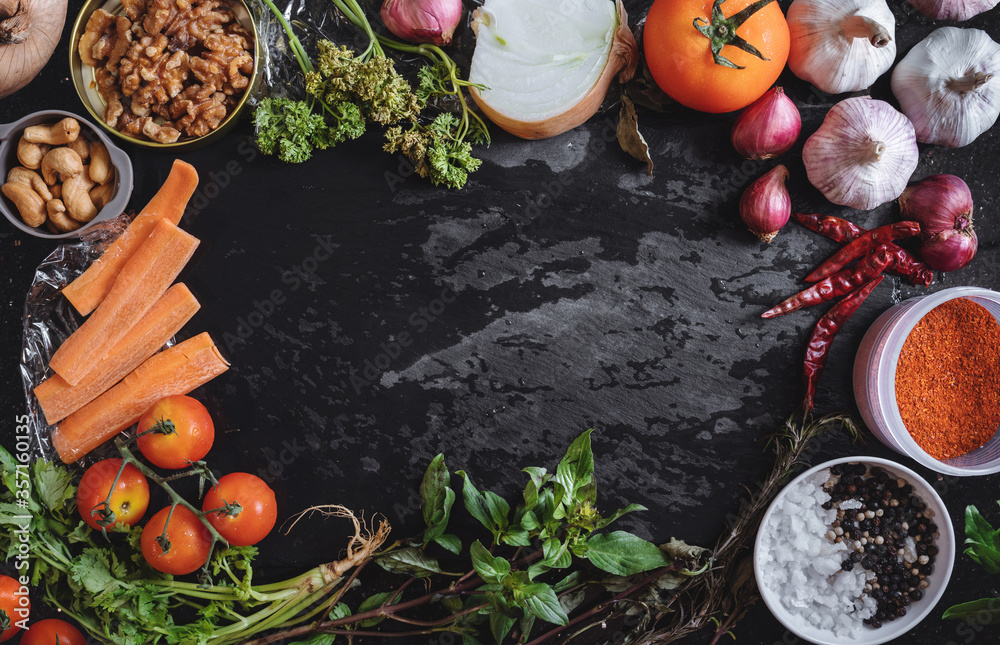 Fresh organic food ingredient, vegetables, herb and spices on black stone texture. Healthy Food Background