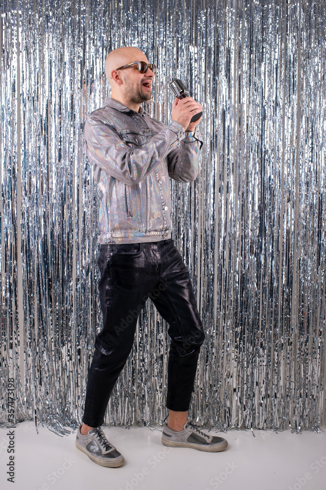 A man without hair with sunglasses in a shiny shirt, black leather pants and grey sneakers sings in a small silver microphone