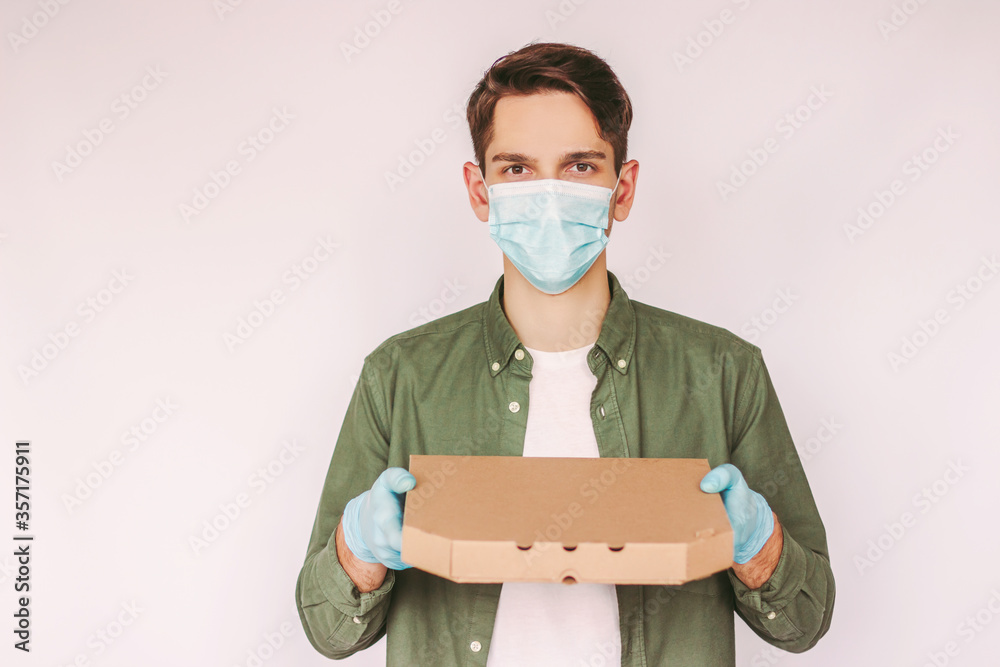 Portrait young delivery man in medical face mask and protective gloves hold cardboard pizza box in hands isolated on white background. Happy takeaway fast food delivery service employee carry pizza