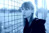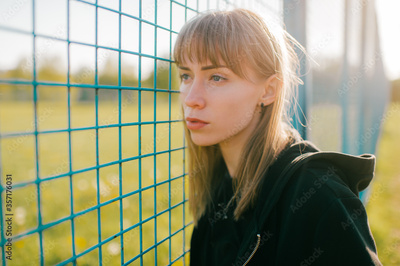 Portrait of a beautiful Caucasian girl with short blond hair, banged in a black jacket snuggled face to the net