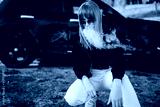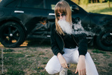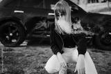 Beautiful young caucasian woman in white jeans, white trainers and black jacket take photos with black broken car and smokes a sigarette