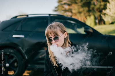Beautiful young caucasian woman in white jeans, white trainers and black jacket stands near old black car outside and smokes