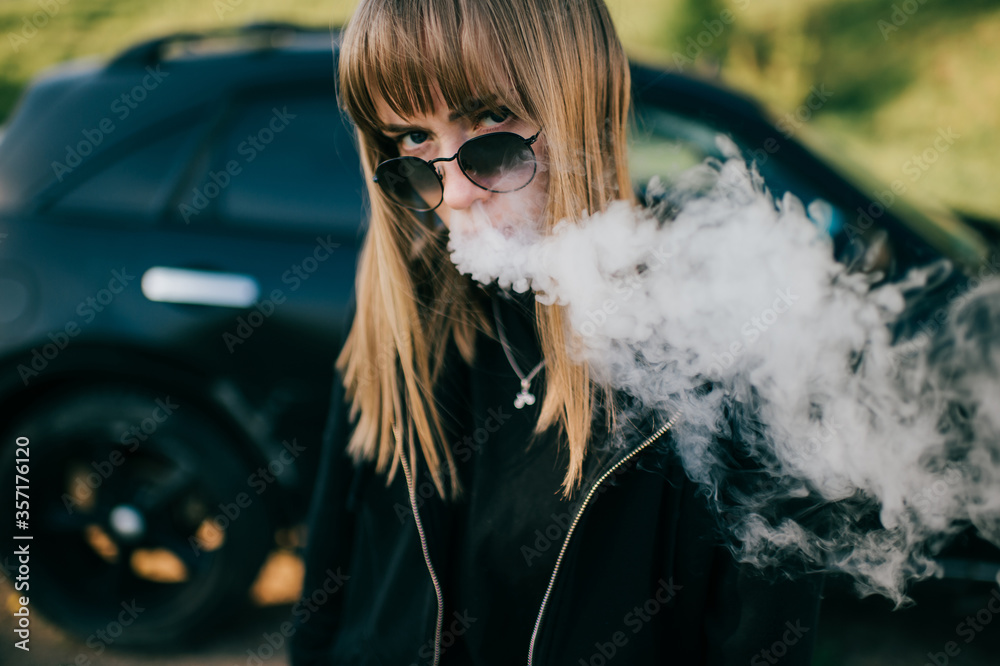 Beautiful young caucasian woman in white jeans, white trainers and black jacket stands near old black car outside and smokes
