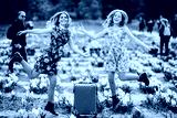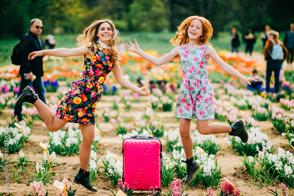 Attractive child with long red hair rejoices with her pretty tall sister relaxes and rejoices in the big flower garden at the weekends