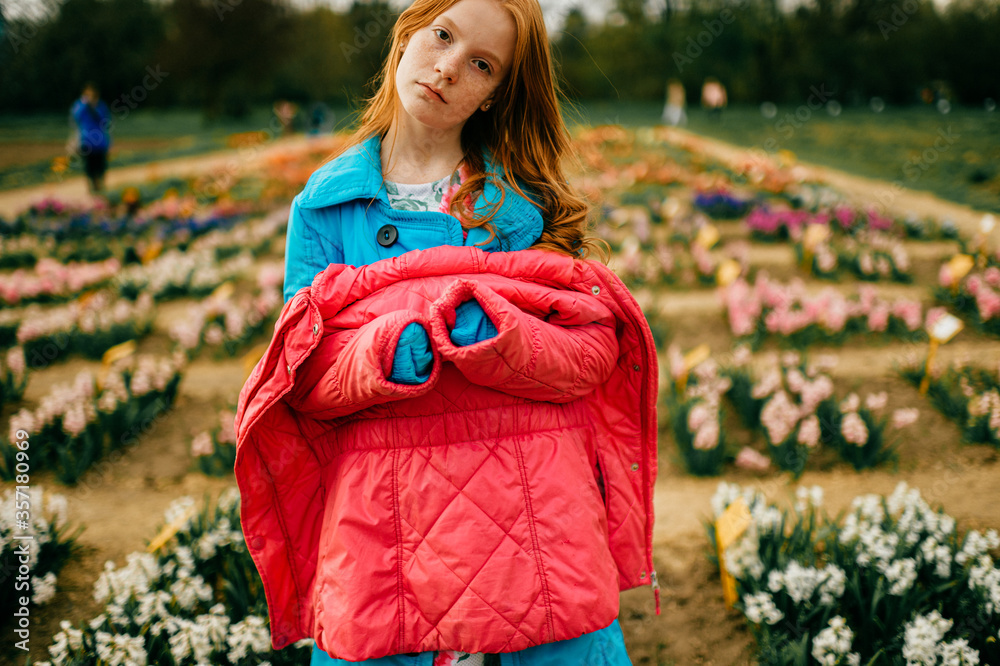 Portrait of strange red head girl in long blue coat and pink warm jacket relaxes and thinks about something in the big flower garden.