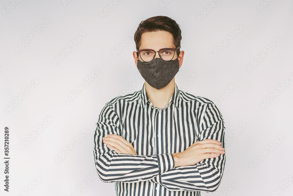 Portrait young successful businessman in protective face mask, eyeglasses keep arms crossed isolated on white background. Confident man professional entrepreneur in stylish eyewear, medical face mask