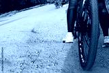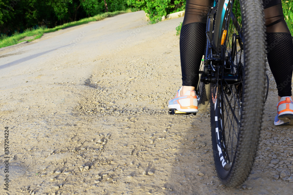 .Legs of a young girl on the pedals of a sports bike. The rear wheel of a sports bike on which the girl is sitting.