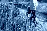 .A boy is cycling in a green meadow with flowers. The boy rides a bicycle in the warm sun.