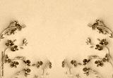 Symmetric flower composition. Pattern made of little wild blue flowers on coral background.