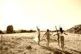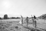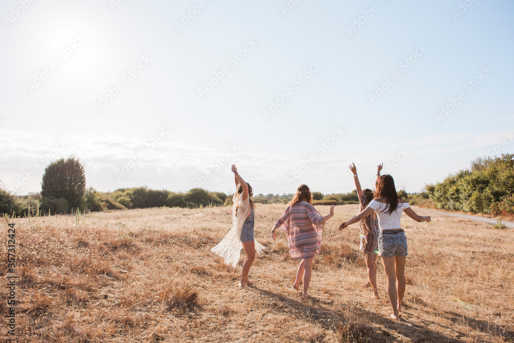 Carefree boho women dancing in sunny rural field