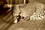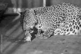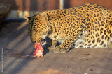 A hungry lynx eats raw meat, an animal at dinner in the early evening.