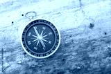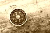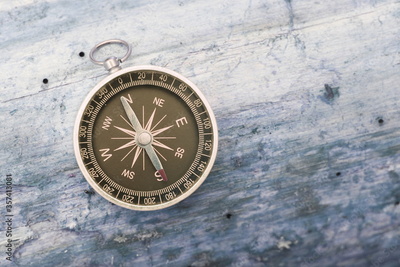 round compass on blue wooden background as symbol of tourism with compass, travel with compass and outdoor activities with compass