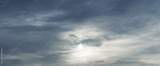Panorama of a majestic gray sky with sun over horizon. High resolution, no birds, no noise. Sun through stormy clouds.