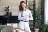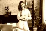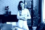 Attractive woman working on a tablet in a home office.