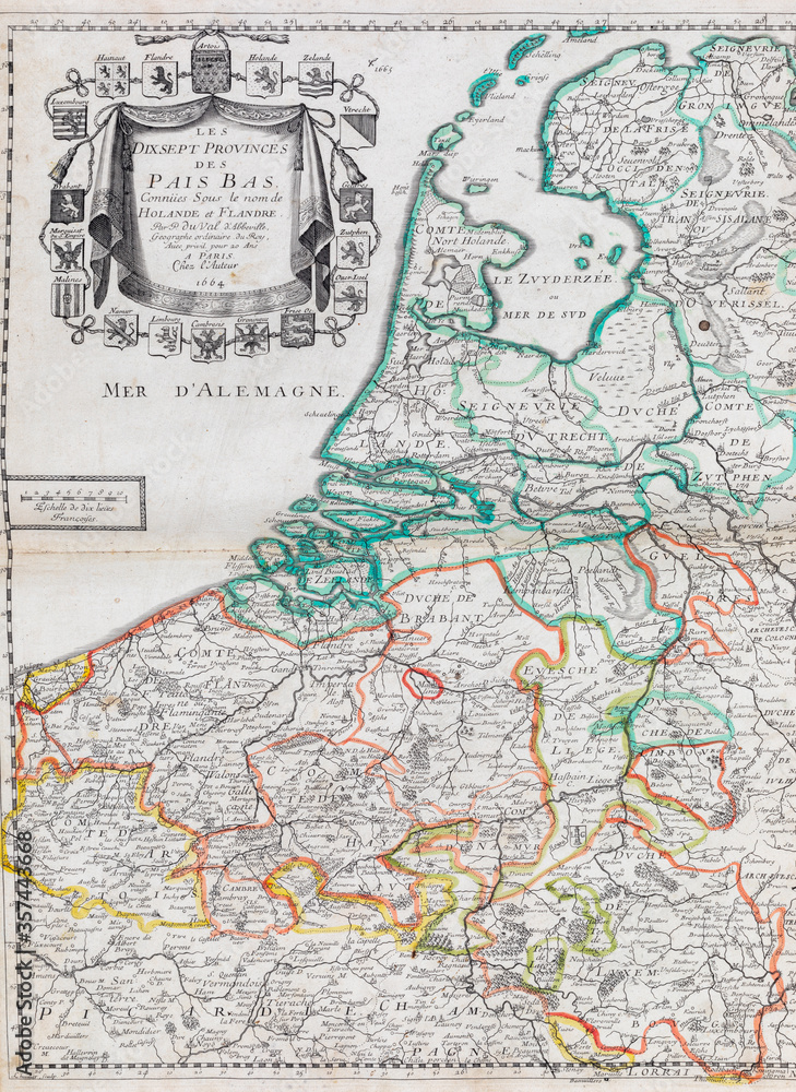 Old map of Netherlands and Belgium - From an 1656 Atlas of Geography from P. du Val - France (Private collection)