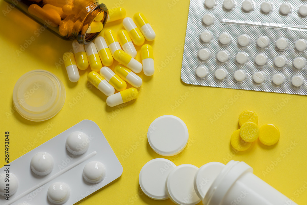 layout of tablets, capsules, instant drugs on a yellow background, the concept of a pharmacy, various forms of painkillers, first aid for pain