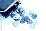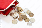 red vintage wallet, Russian coins, rubles and copecks close-up, the concept of a living wage, social pension, indexation of pension payments
